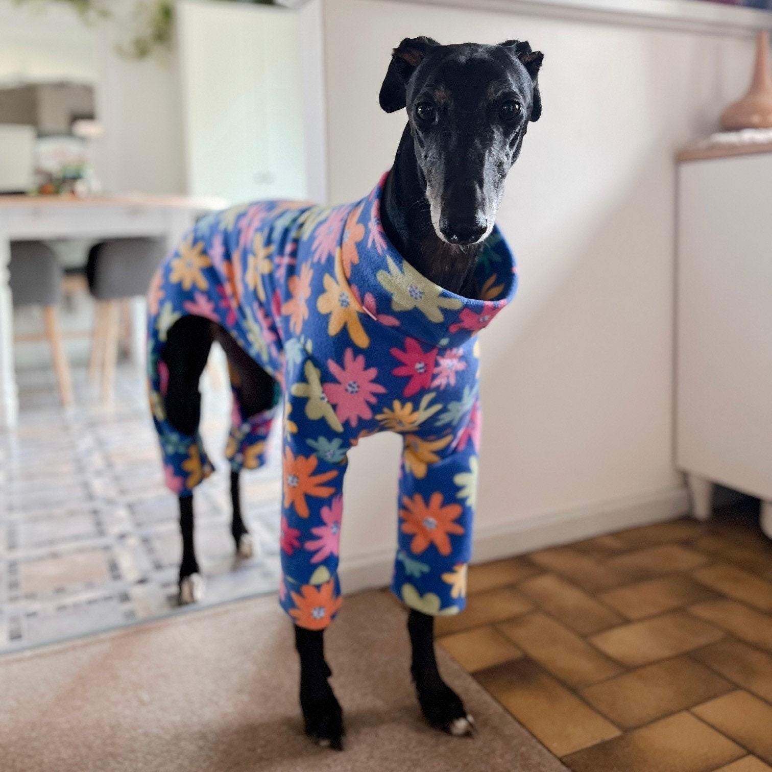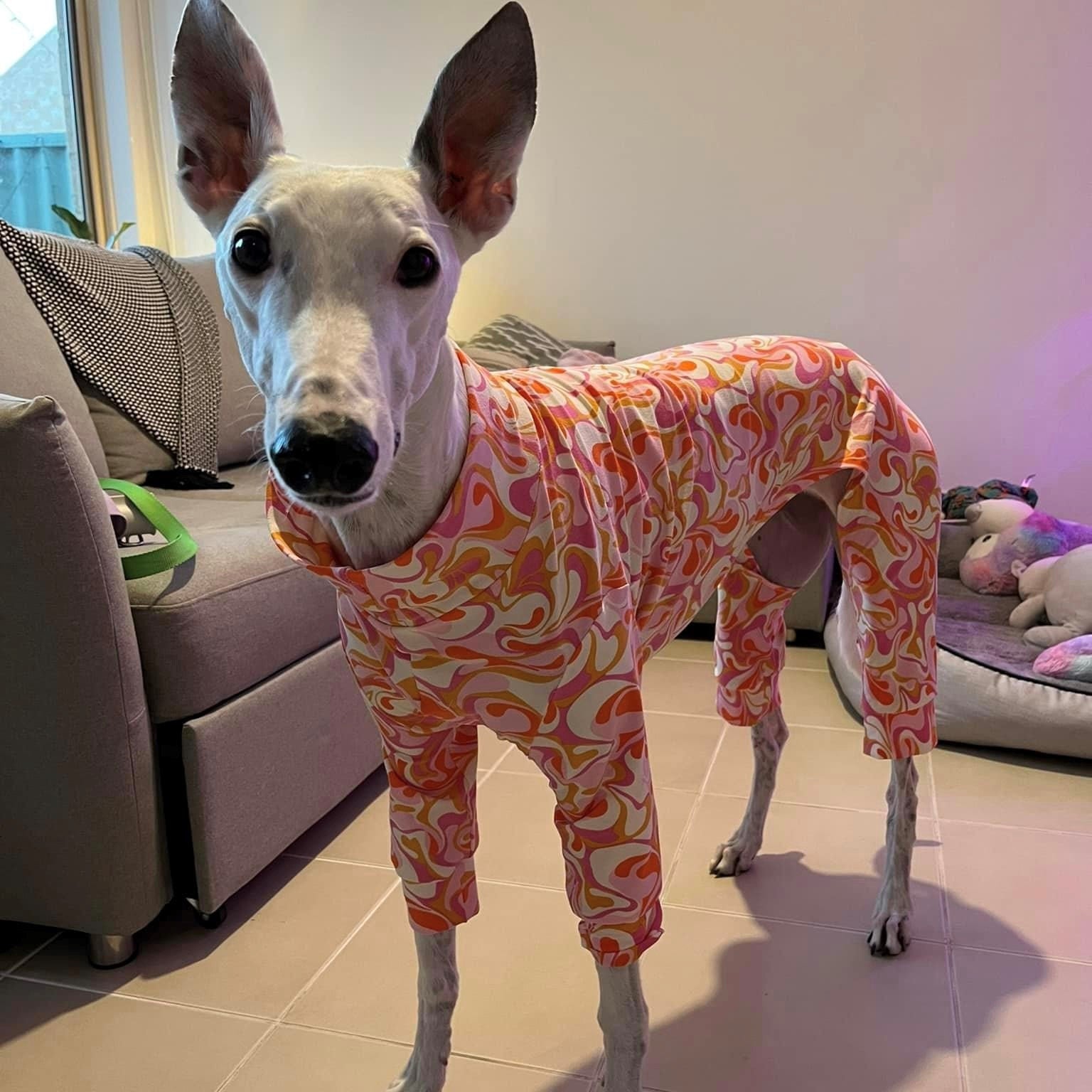 Sew cozy 4-leg pyjamas for your greyhound with this easy PDF sewing pattern – designed for deep-chested sighthounds such as greyhounds.