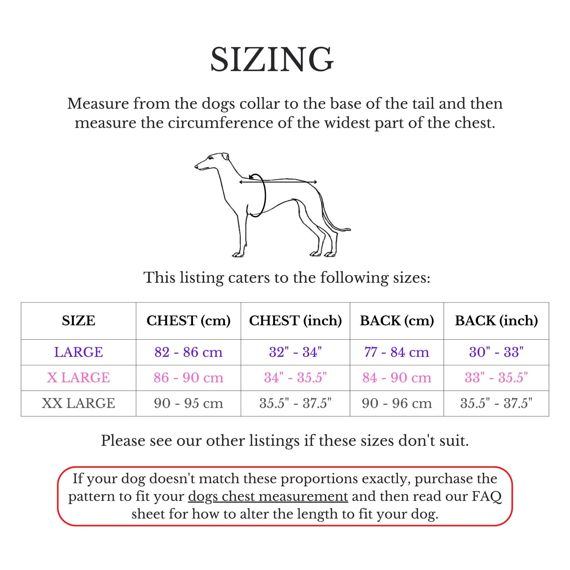 This downloadable PDF sewing pattern guides you create a warm, double layer fleece coat or a single-layer waterproof rain coat for your greyhound, whippet, or other deep-chested sighthounds. It’s designed for maximum comfort, fit, and weather protection. The pattern provides you with the flexibility to choose from two different collar/neck piece options and two options for your velcro strap under the belly.