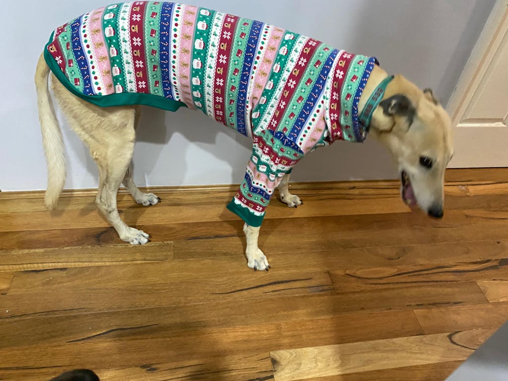 A PDF sewing pattern designed for whippets and other deep-chested sighthounds. Includes both turtle neck and t-shirt variations with sleeve/hem options.