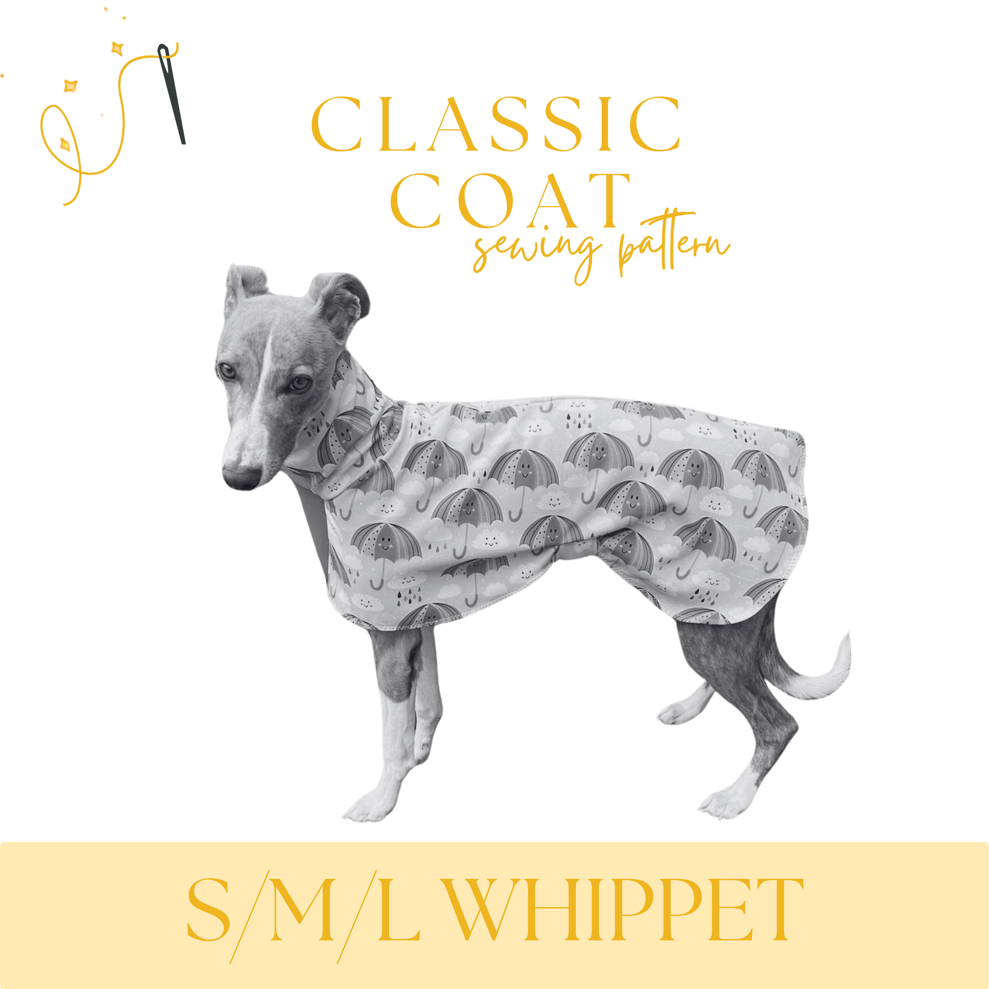 Make your own fleece housecoat or raincoat for whippets with this PDF sewing pattern – tailored for dog breeds with deep chests. Easy to print and sew at home.