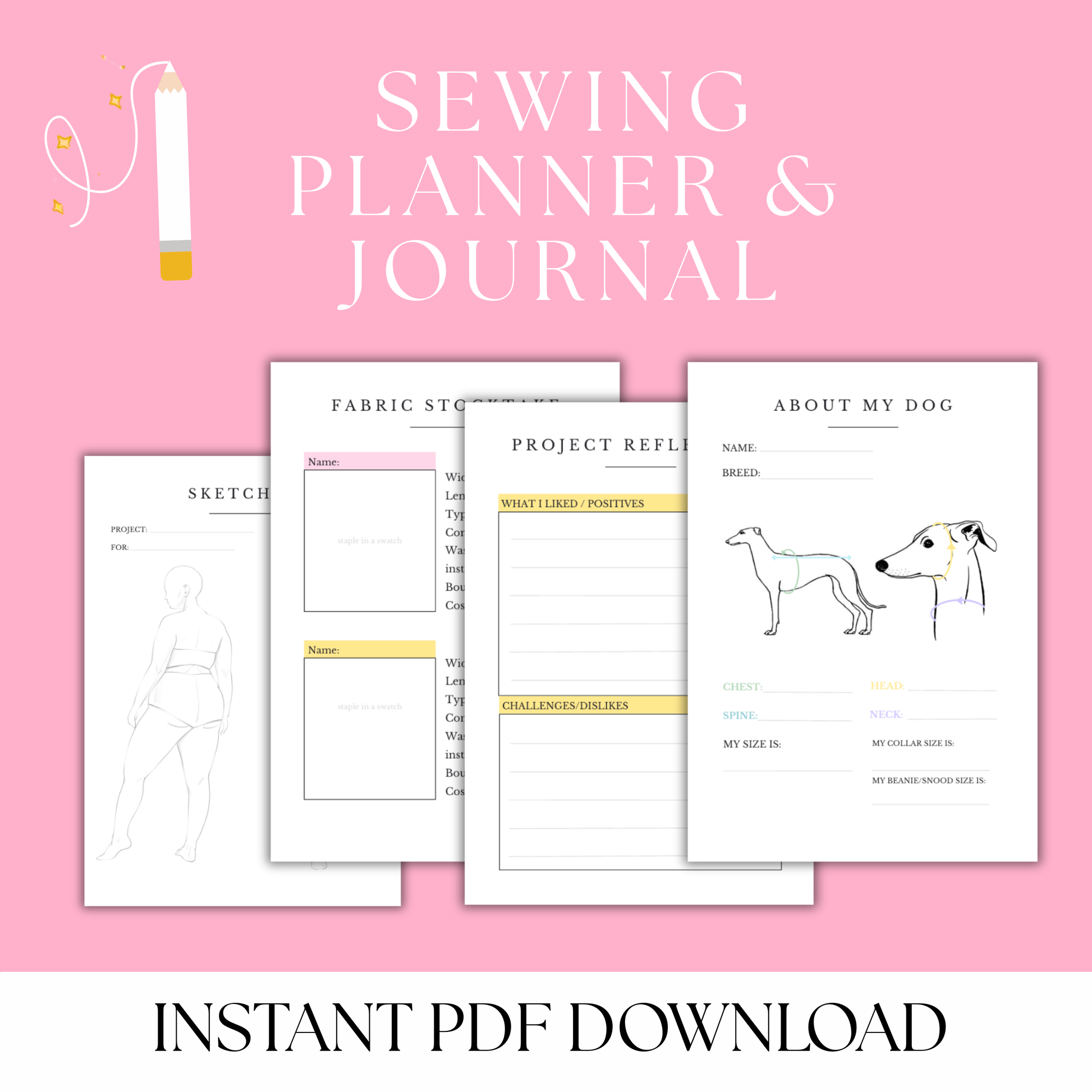 Ideal for people who have a stash of fabric, plenty of ideas and want to keep track of their progress, this PDF can be instantly printed at home, or sent to the print shop for binding.